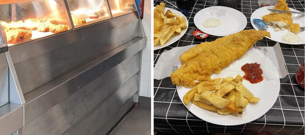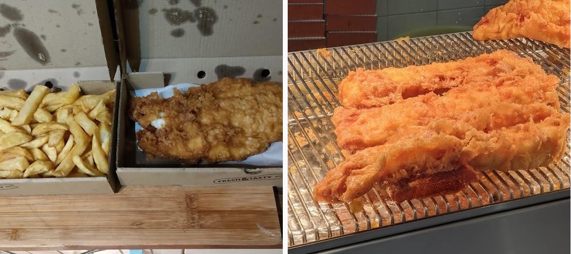 Great quality fish and very well done chips. Tasty, light batter which really helped compliment the fish. Generous portions sizes. Staff were also very friendly and helpful in what to order, which added to the overall experience. We ordered large cods, chips, curry sauces (again, good portions), mushy peas, scampi and both battered and standard sausage. Highly recommend this traditional fish and chips bar.